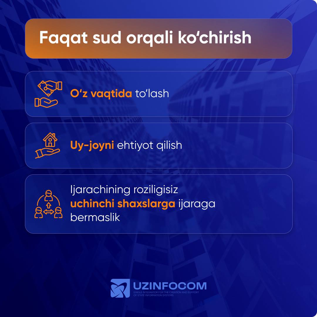 - Yodda tuting: uydan ko‘chirish faqat sud orqali va jiddiy qoidabuzarliklar (masalan, 6 oydan ortiq to‘lov qilmaslik) bo‘lganda amalga oshirilishi mumkin.